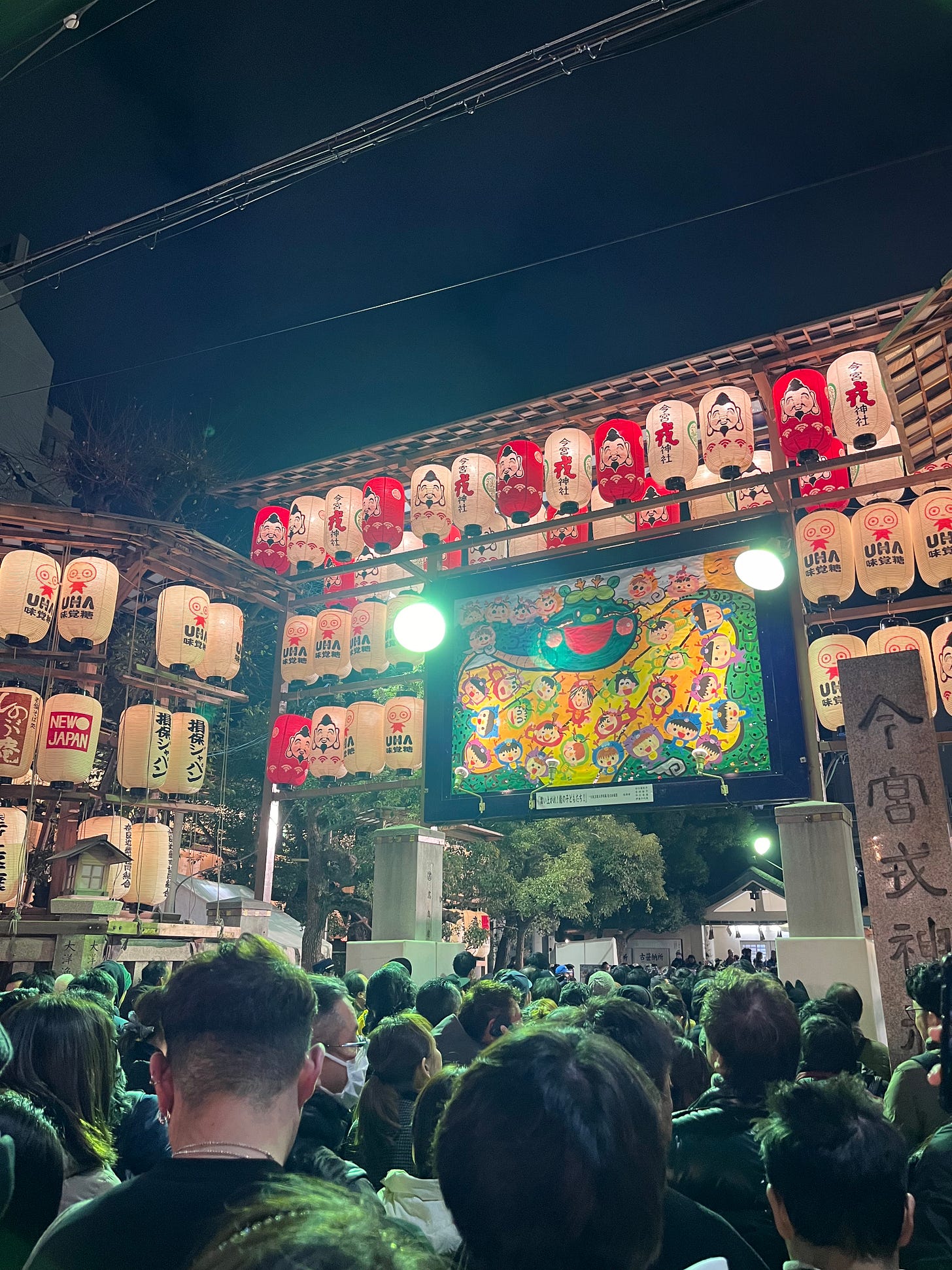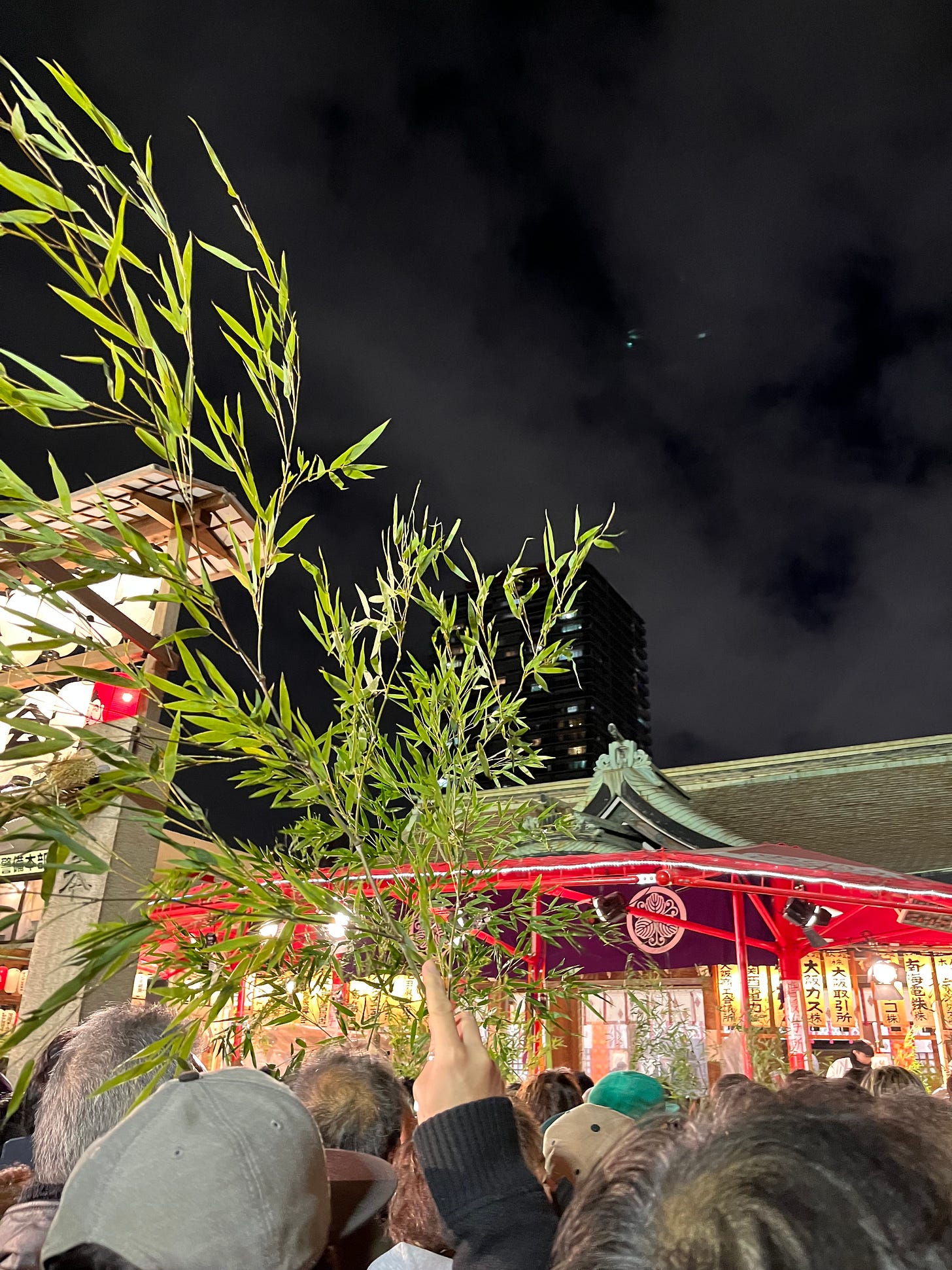 On a random Wednesday in January, I overheard a coworker talking about the Toka Ebisu festival at Imamiya Ebisu Shrine in Osaka. I decided to look it up and made plans with a friend to go that evening. I’m especially glad I did, because this festival is celebrated predominantly in the Kansai region of Japan, where Osaka is, but also because it turned out to be quite the ‘Osaka’ evening — lively, a bit chaotic, lots of drinking involved. Toka Ebisu happens annually on the 10th of January but celebrations range for a few days on either end. Business owners come to wish for good fortune in the new year by praying to Ebisu-Sama (known colloquially as EbisSan), one of the seven lucky gods in the Shinto tradition. EbisSan was known for being a talented fisherman and is depicted holding a sea bream (tai in Japanese). Imamiya Ebisu Shrine in Osaka hosts the biggest celebration of this event. Visitors receive lucky bamboo reeds, pay their dues while praying to EbisSan, and buy amulets to hang in their businesses. Around the main shrine hall of the shrine are hundreds of red lanterns painted with business names — I’m guessing donors to the shrine. It was funny to see my gas company, Osaka Gas, illuminated on one of the red lanterns. Hard to think they’ll need to pray for good luck this year with their monopoly over the city.