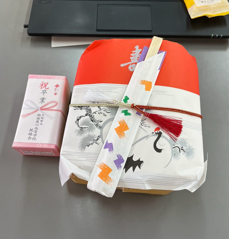 Our school’s cafeteria is being bought by a new company, meaning the staff, menu, and prices are changing. The student council organized a going away party, and the lead chef (a very old Osaka Ojiichan (grandpa)) talked, while holding back tears, reflecting on the number of students he has served in his tenure in the cafeteria since the school opened in 1980. I said goodbye to the three women cooks who befriended me (or maybe vice versa) over the last few months. I would often end up spending half an hour in the cafeteria chatting with them, even when I had planned to quickly grab a rice ball as a snack. They are all around 40 and have kids, and the uncertainty in their goodbye speeches told me they weren’t exactly sure what was next for them. One of them has an incoming freshmen who will be my student next year, so hopefully I can stay in touch that way.